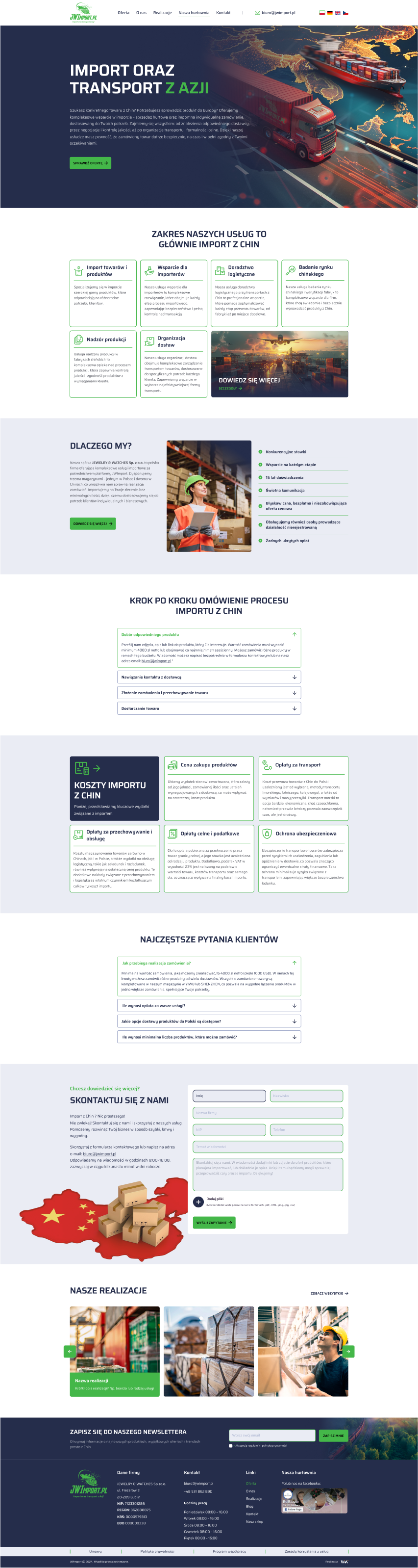 Dla naszego klienta zaprojektowaliśmy i wdrożyliśmy nowoczesną stronę internetową opartą na platformie WordPress. Strona została zaprojektowana z myślą o estetyce i funkcjonalności, co przełożyło się na przejrzysty układ oraz atrakcyjny wygląd. Dominująca kolorystyka to zieleń w połączeniu z granatem i bielą, co podkreśla profesjonalizm i dynamikę marki, a jednocześnie buduje zaufanie wśród klientów. Projekt graficzny uwzględnia elementy nawiązujące do logistyki i importu, takie jak ilustracje transportowe i zdjęcia magazynowe, co idealnie odzwierciedla działalność firmy.