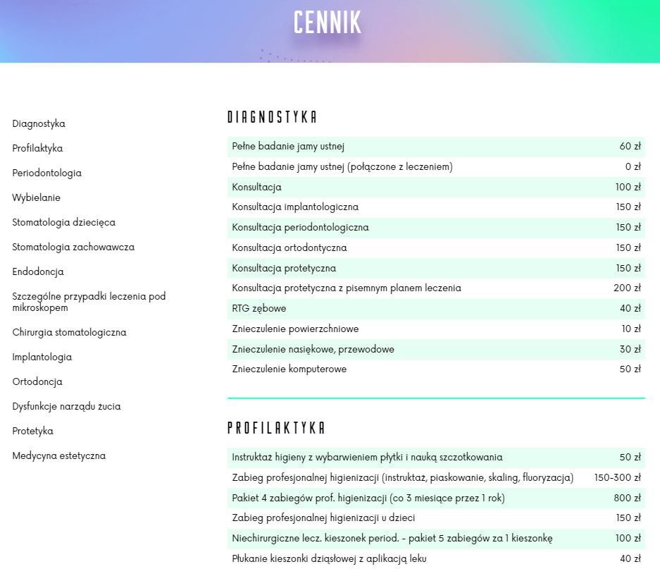 Cennik z podziałem na kategorie na przykładzie idealdent.pl