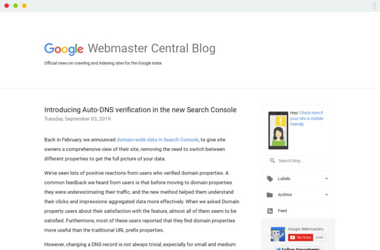 Google Webmaster Central Blog to oficjalna strona Google, na której publikowane są najnowsze informacje ze świata Google przeznaczone dla specjalistów od SEO, SEM, content marktingu itp. Czy jest więc lepsze miejsce, by poznać najświeższe informacje dotyczące aktualizacji Google niż właśnie ta strona? Z artykułów na blogu dowiesz się, co wpływa na pozycję strony w wyszukiwarce i co zrobić, by poprawić swoje statystyki. Dzięki Google Webmaster Central Blog będziesz zawsze na bieżąco ze wszystkimi nowinkami od Google. Na blogu publikowane są informacje dotyczące każdego z produktów Google, także Google Search Console czy Google Ads.