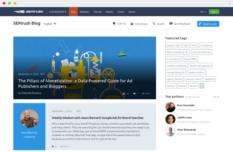 SEMrush to przede wszystkim zestaw narzędzi dla specjalistów zajmujących się marketingiem internetowym. Ułatwiają działania z zakresu SEO, social media, content marketingu, PR czy też badania rynku. Możesz zatem mieć pewność, że zaglądając na ten blog, znajdziesz mnóstwo informacji koncentrujących się właśnie na tych tematach. Aktualności dotyczą przede wszystkich trendów SEO oraz porad z zakresu marketingu w sieci itp. Ten blog to źródło wartościowych informacji tworzonych przez specjalistów z branży. Autorzy tekstów sięgają po najtrudniejsze tematy i objaśniają tajniki SEO.