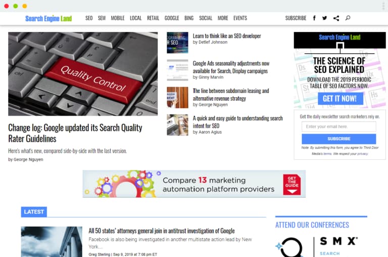Search Engine Land to blog założony przez Danny’ego Sullivana w 2006 roku. Przeczytasz na nim zarówno o nowinkach dotyczących SEO, jak również zaczerpniesz trochę wiedzy technicznej. To miejsce pełne porad i wiedzy eksperckiej, idealnej dla osób, które zajmują się SEO, SEM, marketingiem internetowym, ale nie tylko. Witryna każdego dnia dostarcza wysokiej jakości teksty od specjalistów z branży. Jeśli masz jakiekolwiek pytania czy wątpliwości dotyczące pozycjonowania, istnieje duże prawdopodobieństwo, że tu znajdziesz na nie odpowiedź.