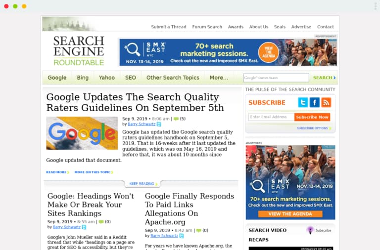 Search Engine Roundtable to codzienna dawka wiedzy dotyczącej SEO. Każdego dnia pojawia się tu kilka artykułów dotyczących marketingu w wyszukiwarce. Jednym z jego bardziej znaczących autorów jest Barry Schwartz, założyciel Search Engine Roundtable i redaktor w Search Engine Land. To świetna strona dla webmasterów, którzy chcą poznawać najnowsze tajniki dotyczące optymalizacji, aktualizacji Google oraz dowiadywać się o najnowszych wydarzeniach ze świata SEO. Search Engine Roundtable posiada także Google Custom Search Engine, czyli wyszukiwarkę, która wyszukuje jedynie fora SEO i SEM, na których znajdują się informacje związane z wpisaną frazą.