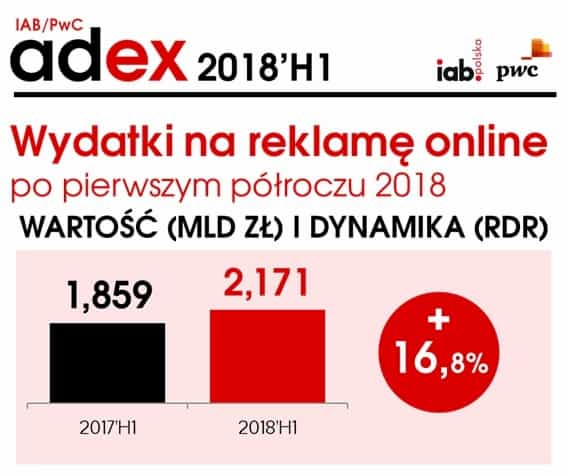 W połowie listopada IAB Polska (Związek Pracodawców Branży Internetowej) i PwC opublikowały raport  AdEx dotyczący wydatków na reklamę cyfrową w Polsce. W raporcie uwzględniono dane za pierwsze półrocze 2018 roku, które porównano z analogicznym okresem w 2017. Wynika z nich, że nakład finansowy na reklamę w Internecie wzrósł w tym okresie o ponad 300 mln zł i osiągnął wartość niemal 2,2 mld zł (dla porównania wartość reklamy internetowej w 1. półroczu 2017 roku wyniosła 1,859 mld zł). Procentowo oznacza to wzrost wydatków na reklamę cyfrową o 16,8% .