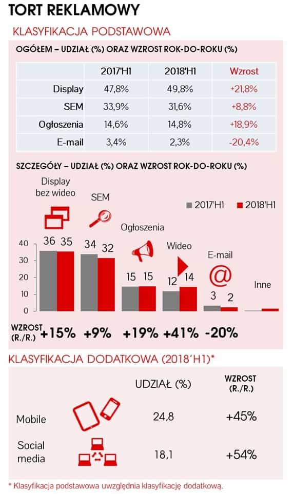 Wartość reklamy online w Polsce - podział tortu reklamowego (za: IAB/PwC AdEx H12018)