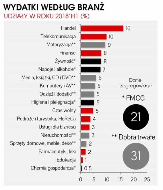 Patrząc na konkretne branże, ponad połowę wydatków na reklamę online w Polsce (51%) generuje 5 branż: handel, telekomunikacja, motoryzacja, finanse oraz żywność. Znacznie wzrosły za to wydatki na reklamę cyfrową sektora produktów szybkozbywalnych (FMCG), czyli różnego rodzaju mięsa, dań gotowych, owoców, warzyw, słodyczy, żywności ekologicznej, produktów sypkich, kosmetyków, artykułów do higieny itd. Tu indeks wyniósł +36%, wliczając w to promowanie alkoholi i napojów (+55%) oraz artykułów higienicznych i pielęgnacyjnych (+49%). Więcej wydaje się także na reklamę online mediów, książek, a także płyt CD i DVD (+37%).
